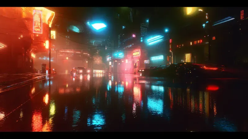 شهری: شهر سایبرپانک آیندهنگرانه در شب، نورهای نئون، بازتاب باران روی خیابانها –ar 21:9